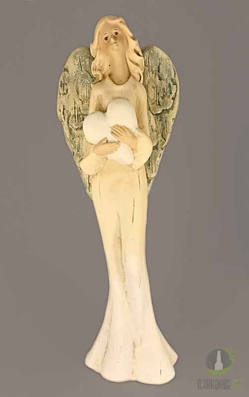 Originální ručně malovaný béžový anděl s bílým srdcem v rukou.