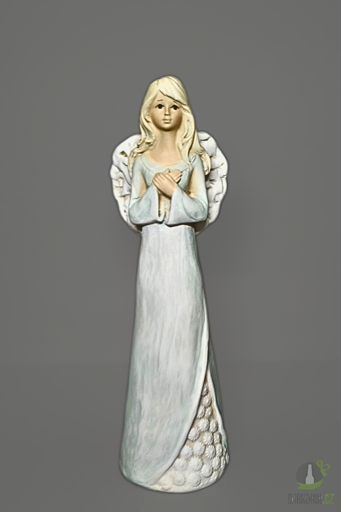 Originální ručně malovaný anděl se světle modrou sukní, překřížené ruce.
