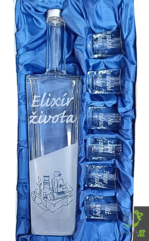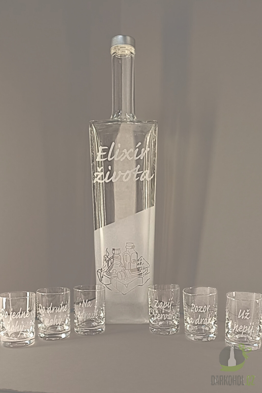 Pískovaná láhev + 6 panáků "Elixír života"
