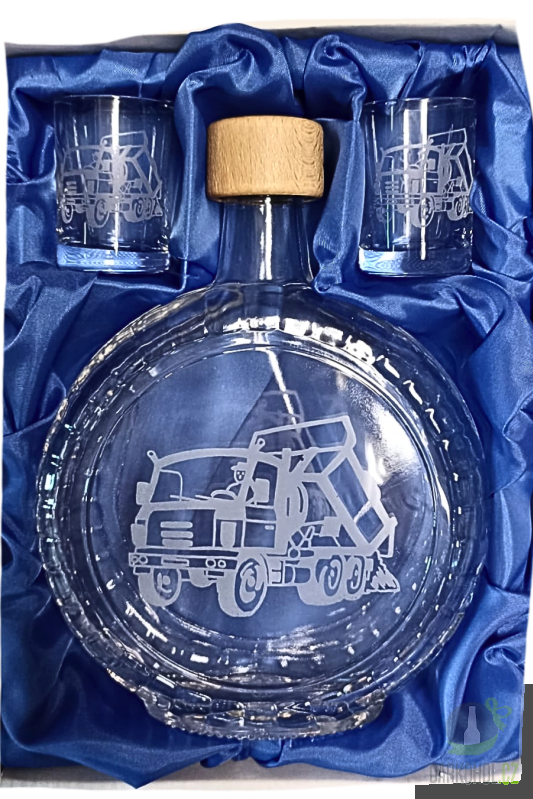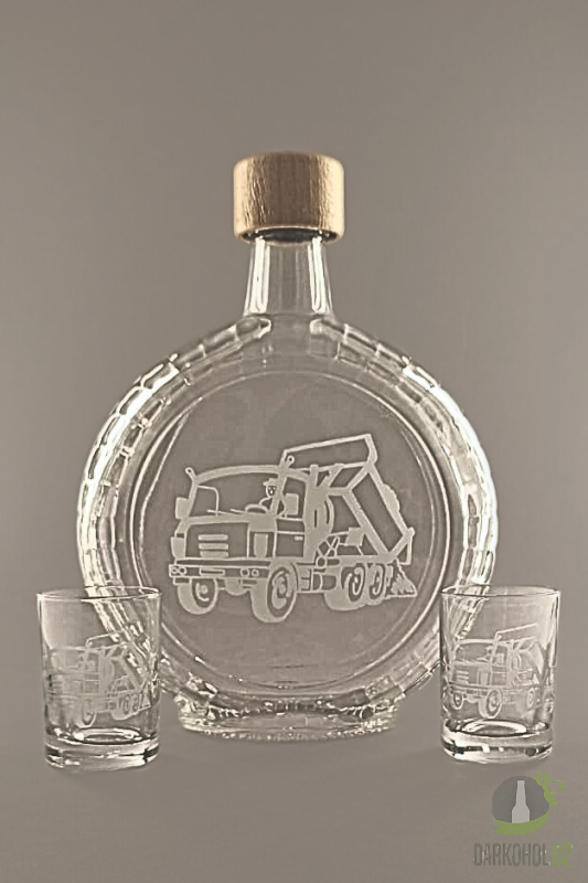 Ručně pískovaná skleněná sada láhve s panáky ve tvaru budíku o objemu 0,5l s číslem 18.