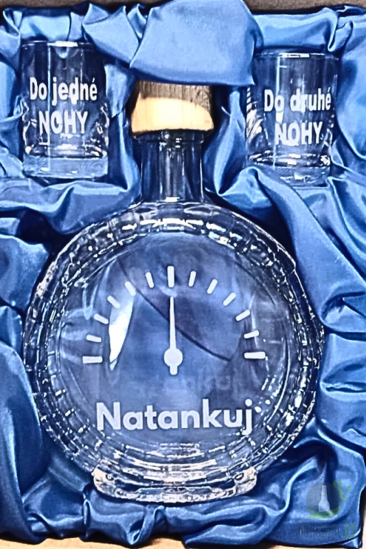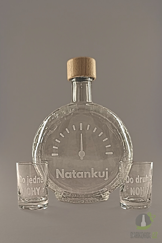 Pískovaná láhev + dva panáky s nápisem "Natankuj"