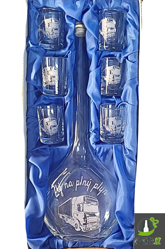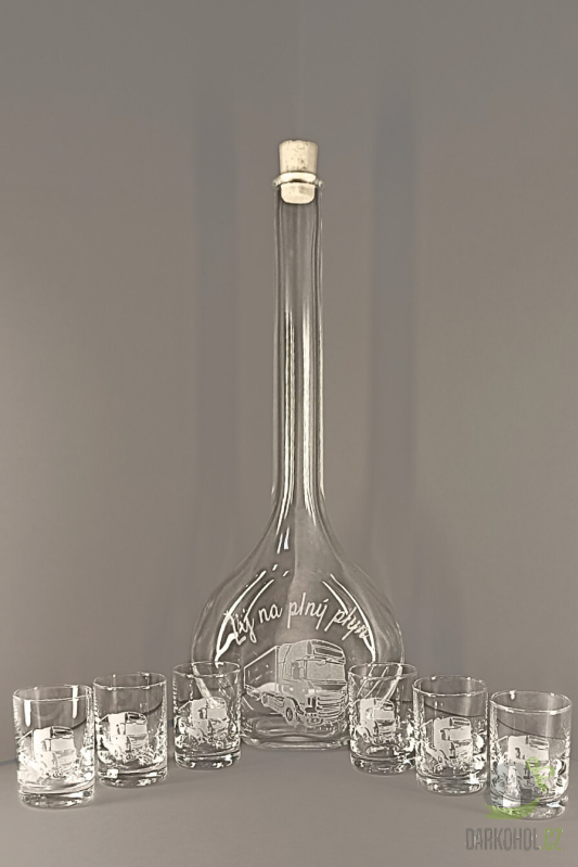 Pískovaná láhev + 6 panáků s motivem kamionu s nápisem "Žij na plný plyn"