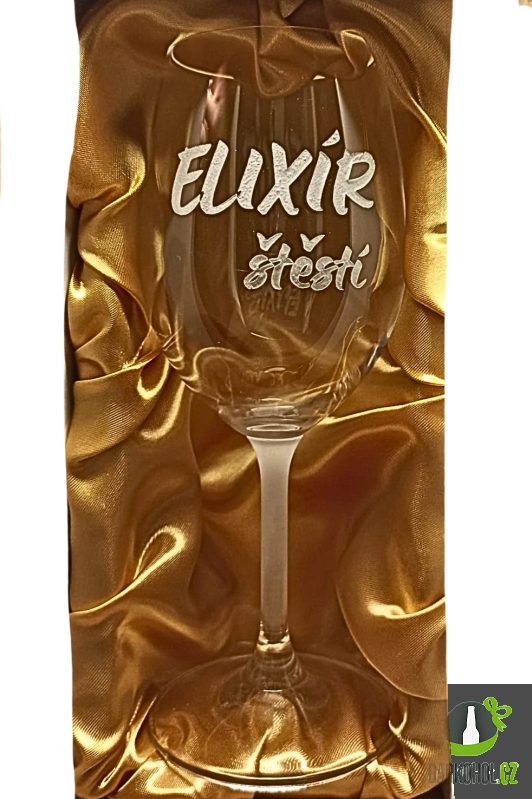 Ručně pískovaná sklenice o objemu 0,35l s nápisem ’’Elixír štěstí’’.