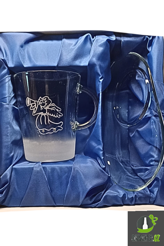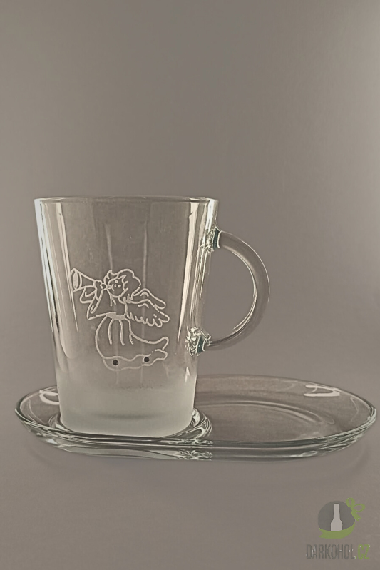 Ručně pískovaná skleněný hrnek s podšálkem ve tvaru šapo o objemu 0,3 l s motivem Anděla