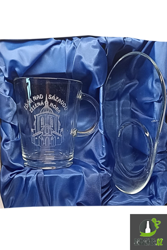 Ručně pískovaný skleněný hrnek s podšálkem ve tvaru šapo o objemu 0,3 l s nápisem "Žďár nad Sázavou Zelená hora" s motivem kostela sv. Jana Nepomuckého na Zelené hoře ve Žďáře nad Sázavou
