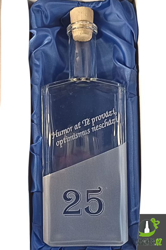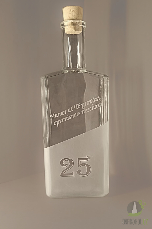Ručně pískovaná skleněná láhev ve tvaru knihy o objemu 1l s nápisem " Humor ať ťě provází,optimismus neschází 25 let "