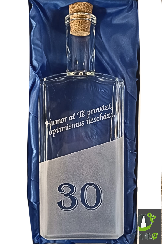 Ručně pískovaná skleněná láhev ve tvaru knihy o objemu 1l s nápisem " Humor ať ťě provází,optimismus neschází 30 let "