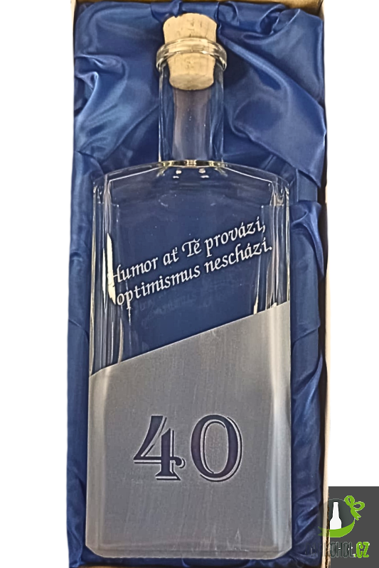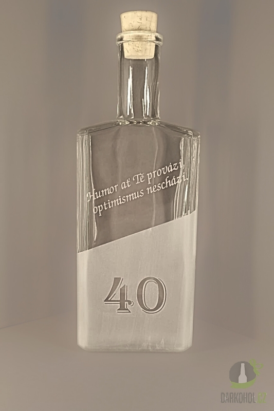 Ručně pískovaná skleněná láhev ve tvaru knihy o objemu 1l s nápisem " Humor ať ťě provází,optimismus neschází 40 let "