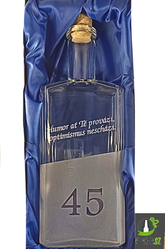 Ručně pískovaná skleněná láhev ve tvaru knihy o objemu 1l s nápisem " Humor ať ťě provází,optimismus neschází 45 let "