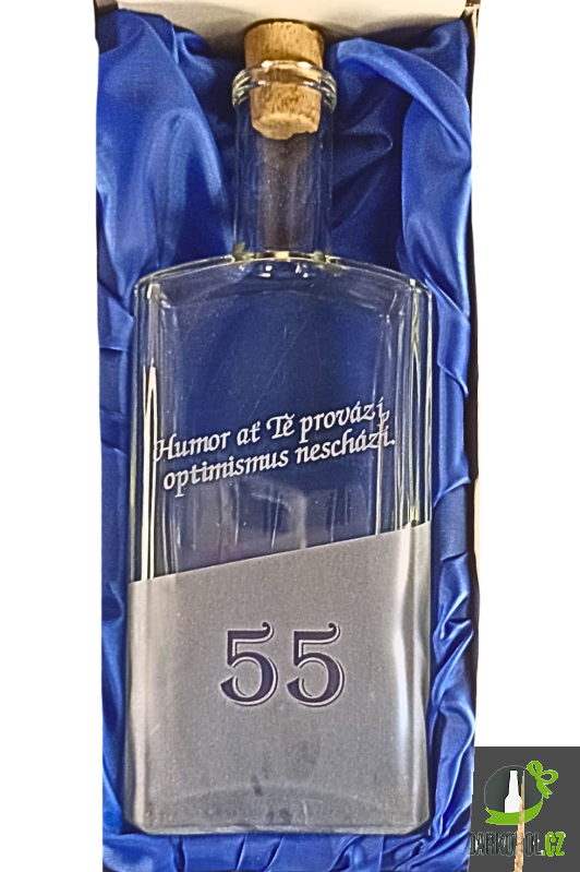Ručně pískovaná skleněná láhev ve tvaru knihy o objemu 1l s nápisem " Humor ať ťě provází,optimismus neschází 55 let "