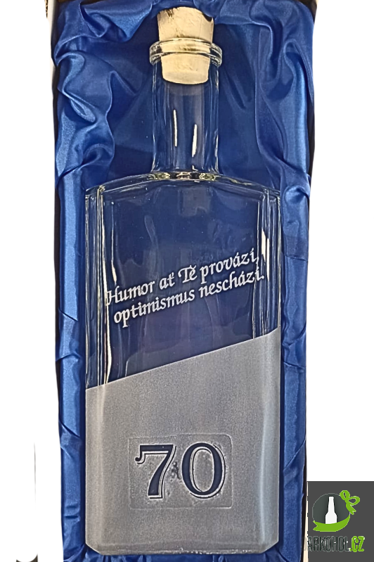 Ručně pískovaná skleněná láhev ve tvaru knihy o objemu 1l s nápisem " Humor ať ťě provází,optimismus neschází 70 let "