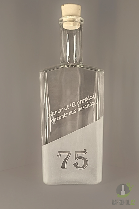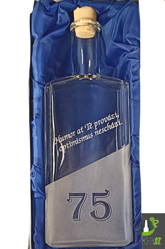 Ručně pískovaná skleněná láhev ve tvaru knihy o objemu 1l s nápisem " Humor ať ťě provází,optimismus neschází 75 let "