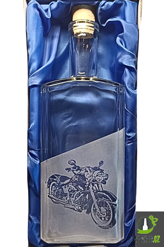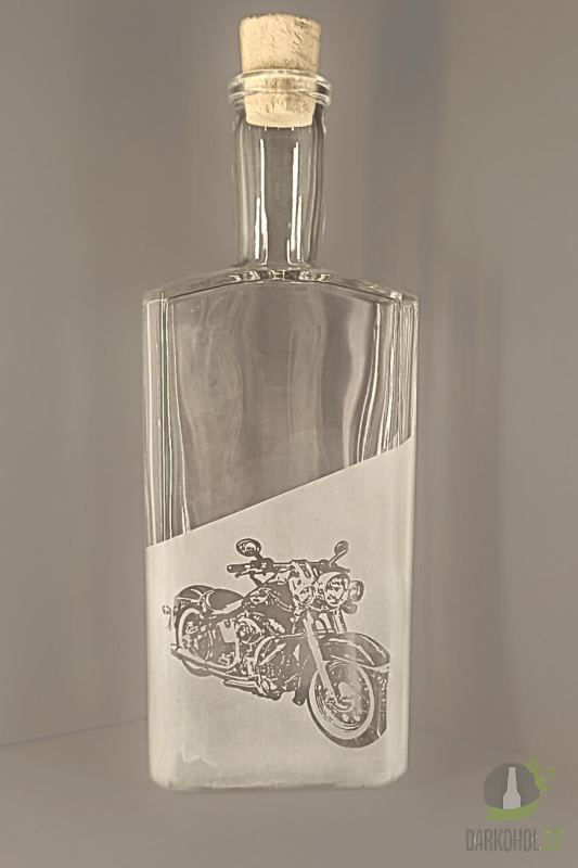 Ručně pískovaná skleněná láhev ve tvaru knihy o objemu 1l s obrázkem Motorky.
