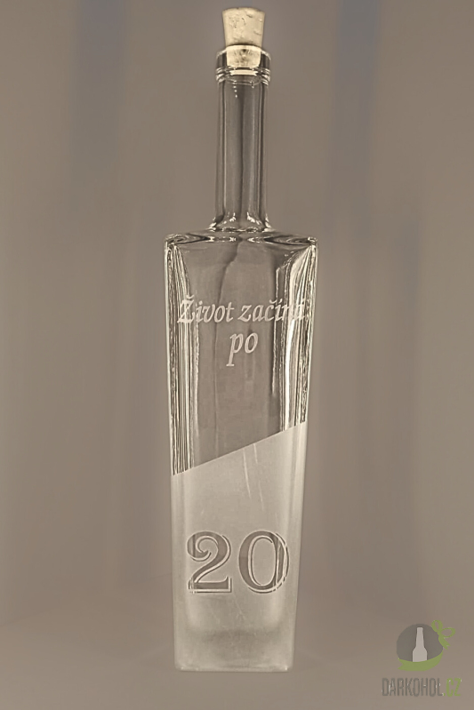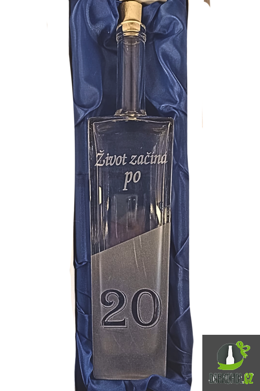 Ručně pískovaná skleněná láhev ve tvaru Axel o objemu 0,7 l s nápisem " Život začíná po 20 " a s motivem švestek