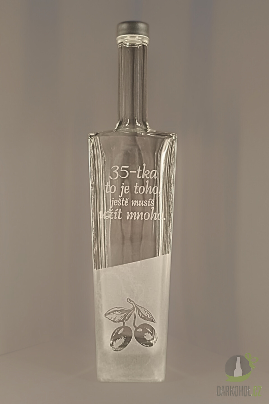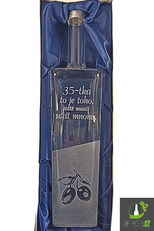 Ručně pískovaná skleněná láhev ve tvaru Axel o objemu 0,7 l s nápisem "35tka to je toho,ještě musíš užít mnoho"s motivem švestek