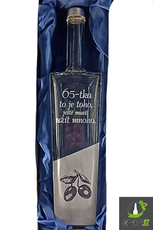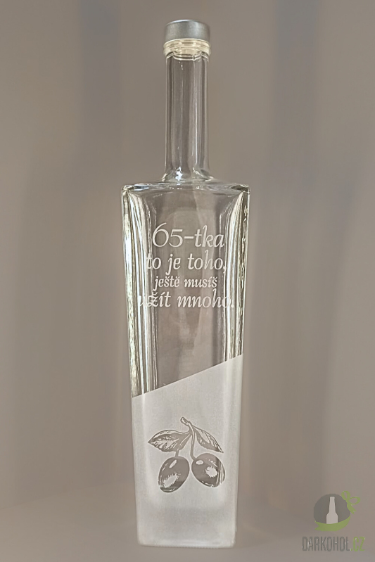Ručně pískovaná skleněná láhev ve tvaru Axel o objemu 0,7 l s nápisem "65tka to je toho,ještě musíš užít mnoho"s motivem švestek