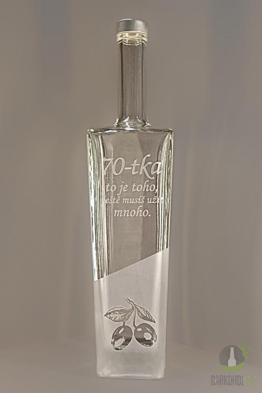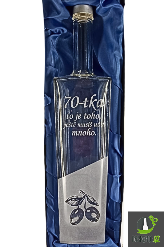 Ručně pískovaná skleněná láhev ve tvaru Axel o objemu 0,7 l s nápisem "70tka to je toho,ještě musíš užít mnoho"s motivem švestek