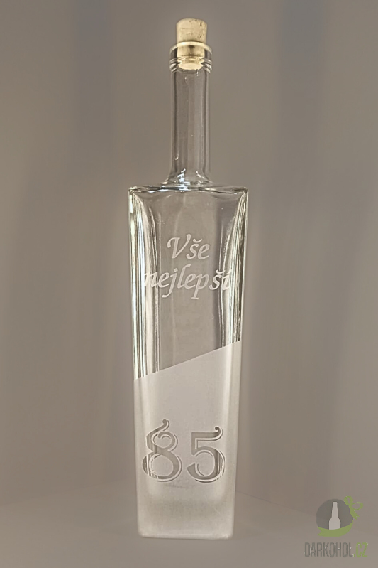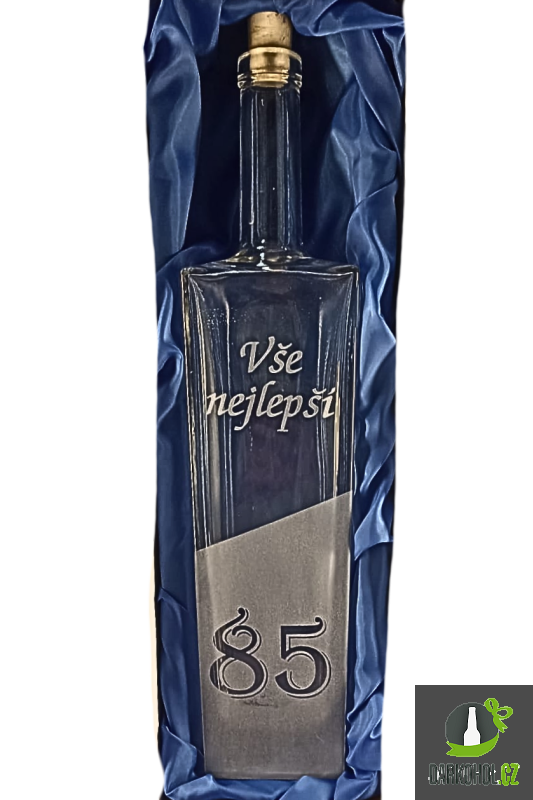 Ručně pískovaná skleněná láhev ve tvaru Axel o objemu 0,7 l s nápisem " Vše nejlepší 85 let " s motivem švestek