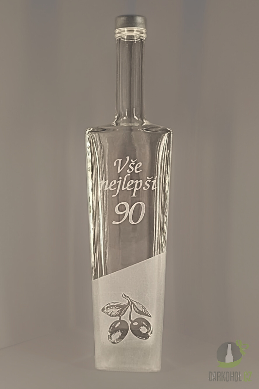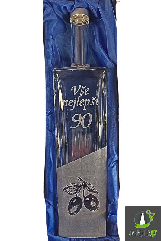 Ručně pískovaná skleněná láhev ve tvaru Axel o objemu 0,7 l s nápisem "Vše nejlepší 90 let" s motivem švestek