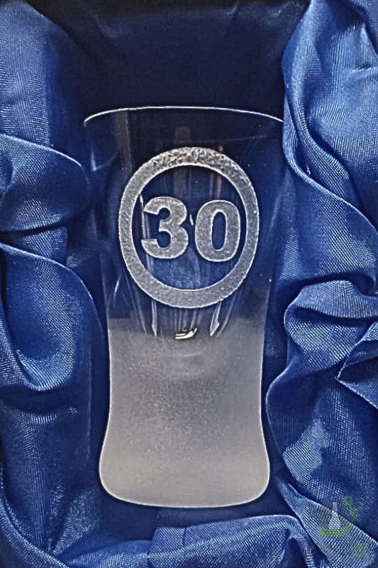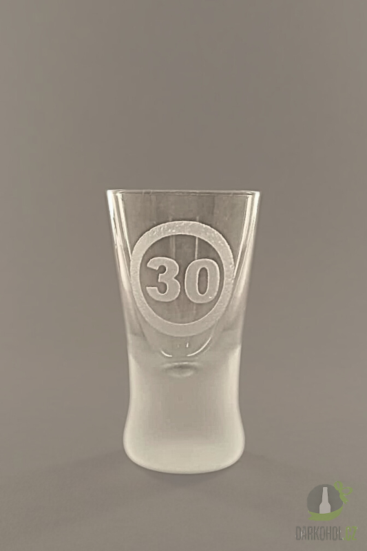 Ručně pískovaný skleněný panák ve tvaru konický o objemu 0,02 l "30" s motivem 30v kruhu