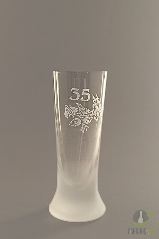 Ručně pískovaný skleněný panák ve tvaru kónickém o objemu 0,05 l s motivem 35 let Růže