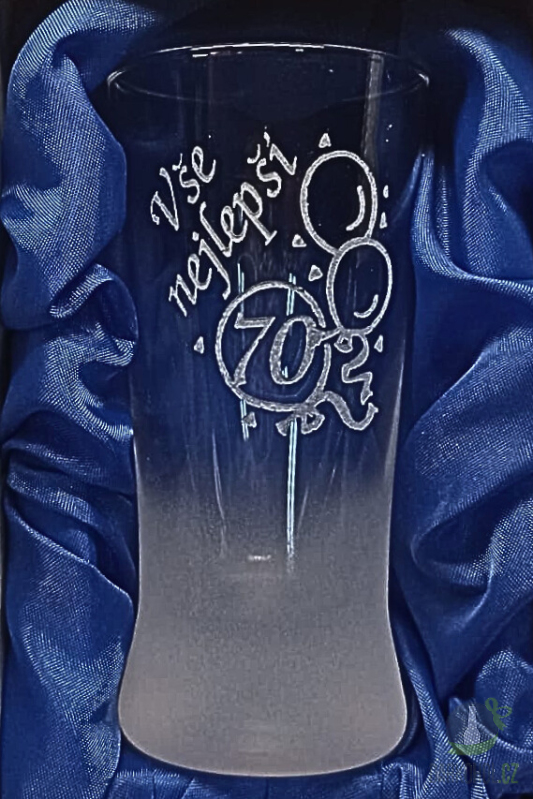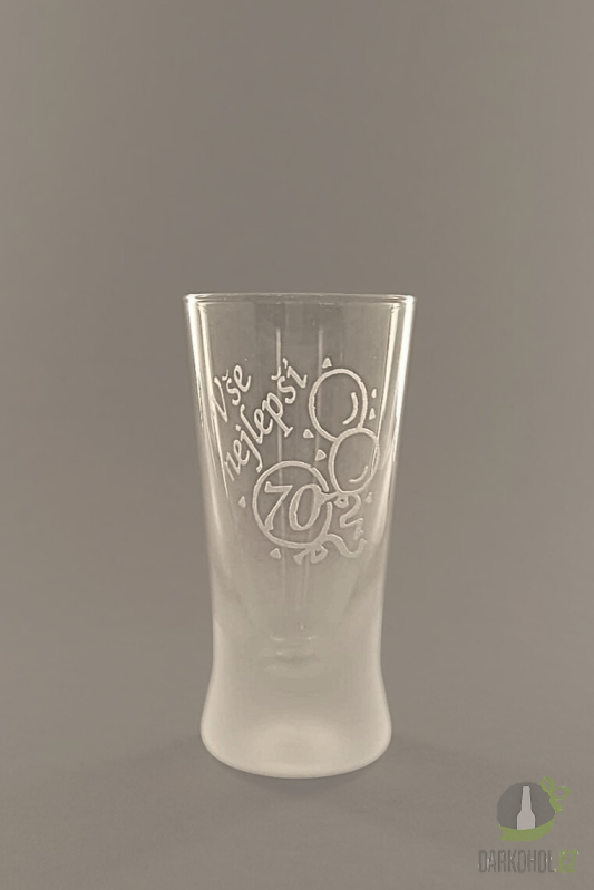 Ručně pískovaný skleněný panák ve tvaru kónickém o objemu 0,05 l s nápisem "Vše nejlepší" s motivem 70let