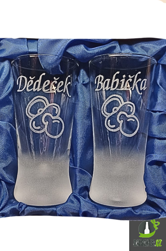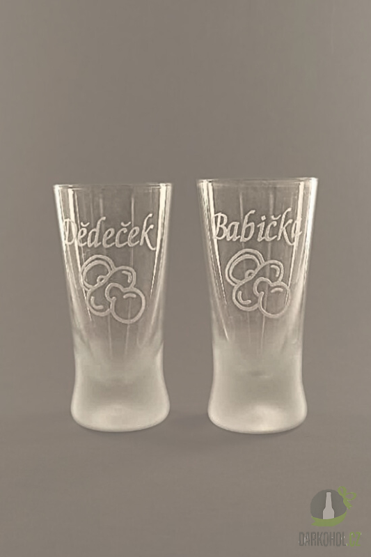 Ručně pískované skleněné panáky ve tvaru kónickém o objemu 0,05 l s motivem Dudlíku s nápisem " Dědeček / Babička " .