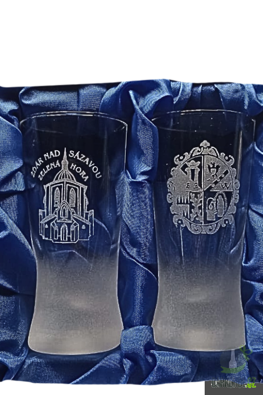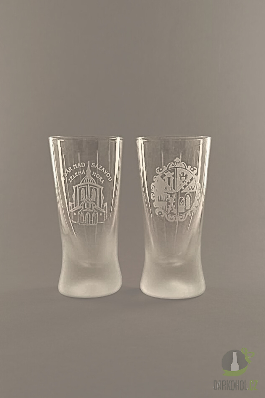 Ručně pískovaná skleněná sada panáků ve tvaru  kónickém o objemu 0,05 l s nápisem "Žďár nad Sázavou Zelená hora" s motivem kostela sv. Jana Nepomuckého na Zelené hoře ve Žďáře nad Sázavou
