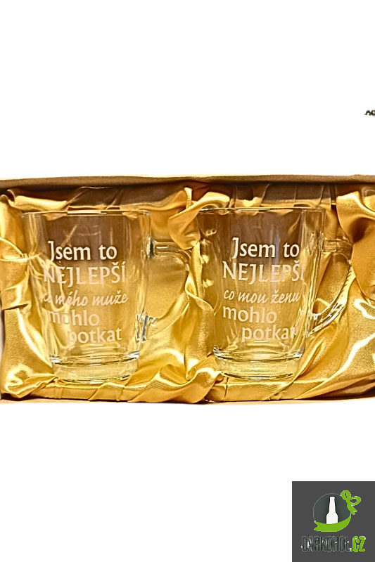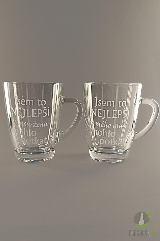 Ručně pískovaný skleněný hrnek ve tvaru Geo o objemu 0,35 l s nápisem "Jsem to nejlepší co moji ženu mohlo potkat"a "Jsem to nejlepší co mého muže mohlo potkat"