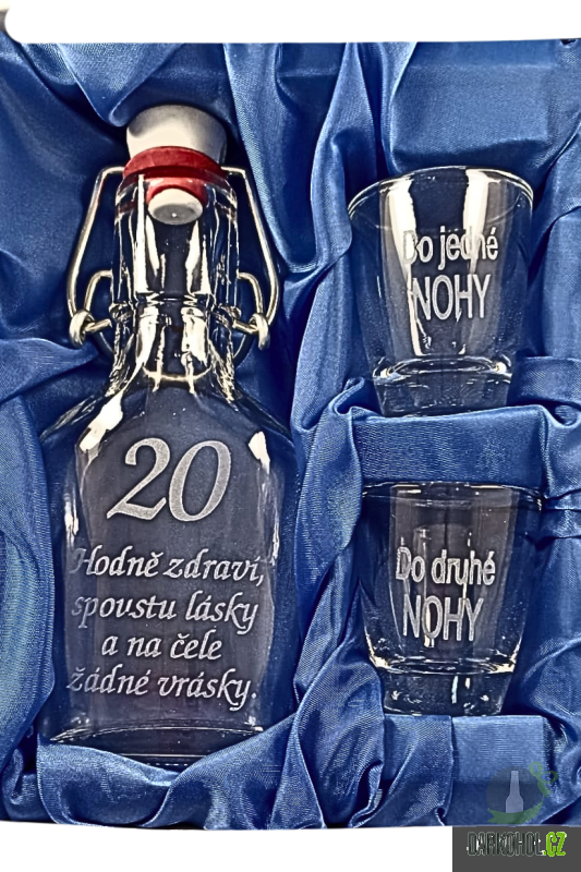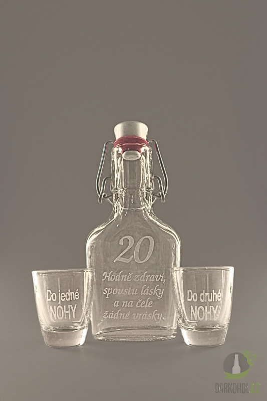 Ručně pískovaná skleněná sada láhve s panáky ve tvaru butylky o objemu 0,1 l s nápisem "Hodně zdraví ,hodně lásky a na čele žádné vrásky" s motivem 20