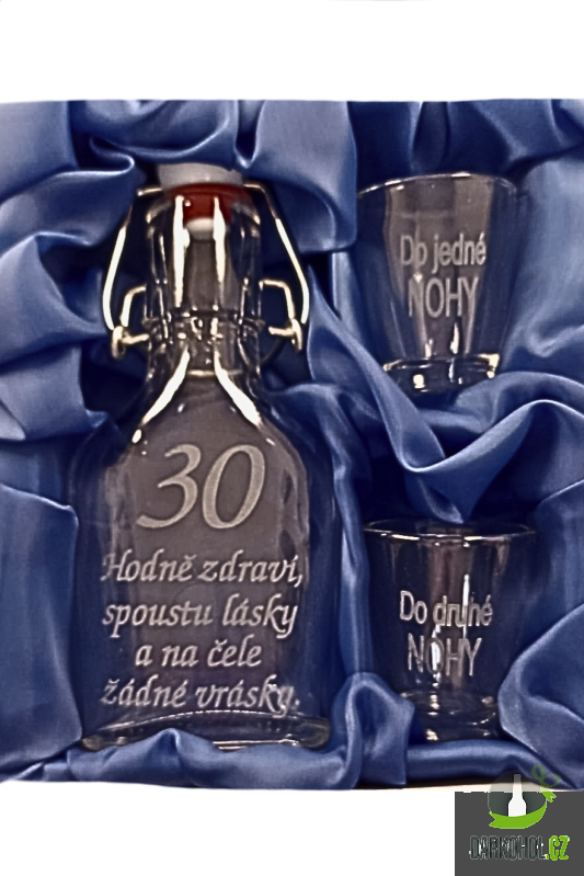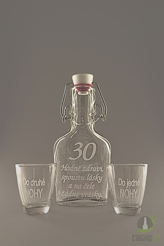 Ručně pískovaná skleněná sada láhve s panáky ve tvaru butylky o objemu 0,1 l s nápisem "Hodně zdraví ,hodně lásky a na čele žádné vrásky" s motivem 30