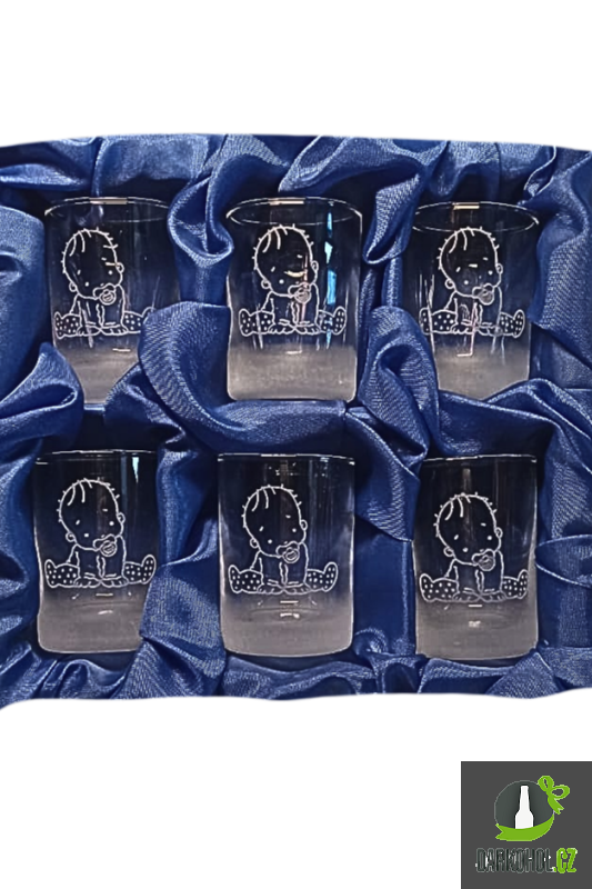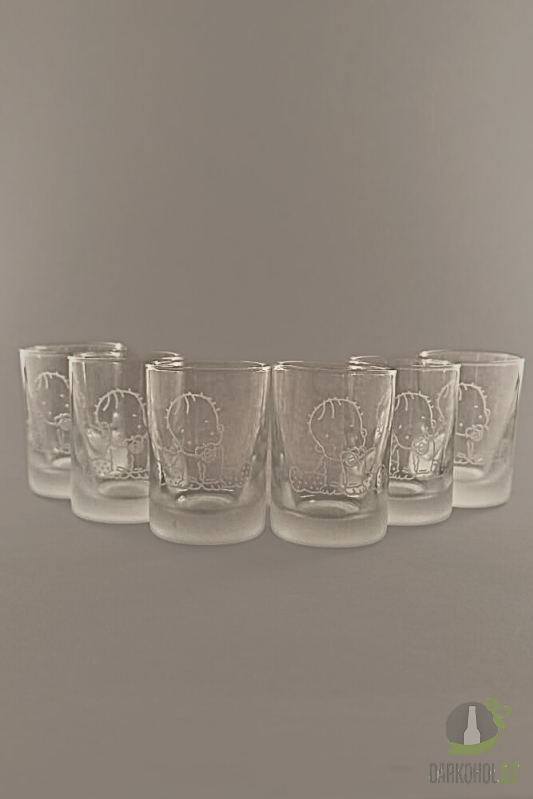 Ručně pískovaná skleněná sada panáků o objemu 0,035 l s motivem Miminka