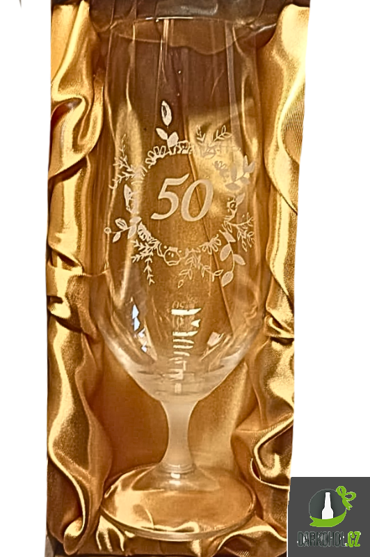 Ručně pískovaná sklenice na pivo ’’50’’ s motivem květin o objemu 350ml.