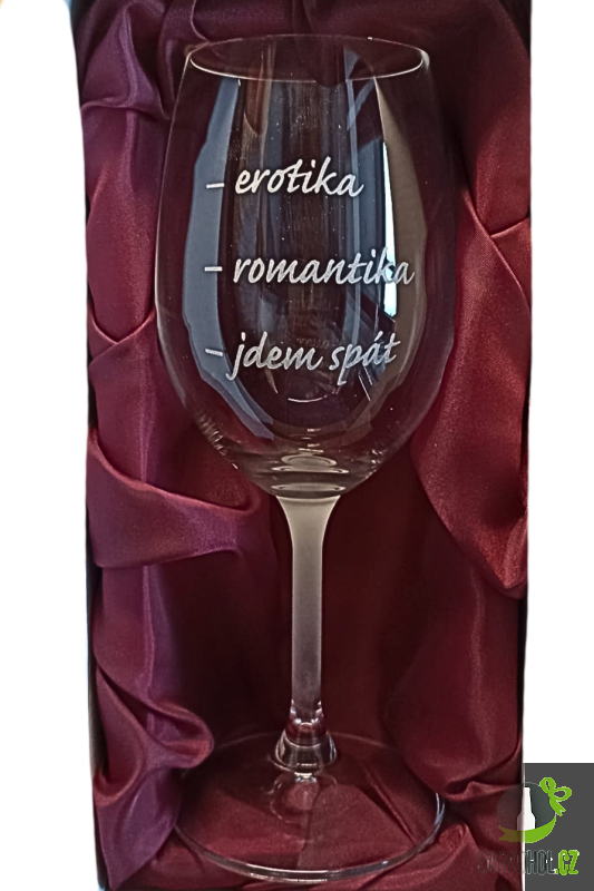 Ručně pískovaná sklenice o objemu 0,35l s textem ’’erotika, romantika, jdem spát’’.