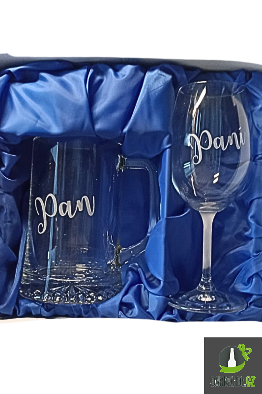 Ručně pískovaná sklenice na víno s nápisem ’’Paní’’ o objemu 350ml a pískovaný půllitr s uchem s nápisem ’’Pan’’ o objemu 500ml.