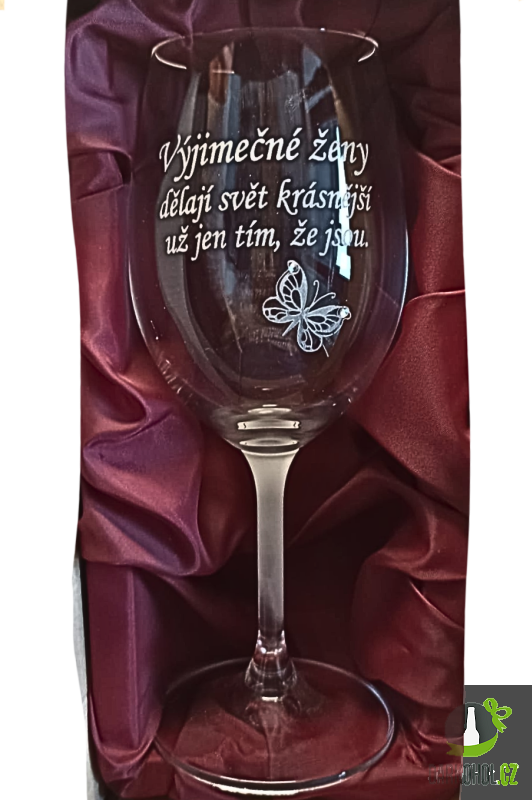 Ručně pískovaná sklenice o objemu 0,35l s nápisem ’’ Výjmečné ženy dělají svět krásnější už jenom tím, že jsou’’ a obrázkem motýlka.