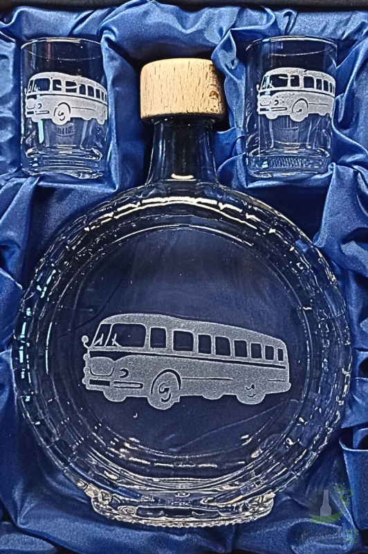 Ručně pískovaná skleněná sada láhve s panáky ve tvaru budíku o objemu 0,5 l s motivem Autobusu