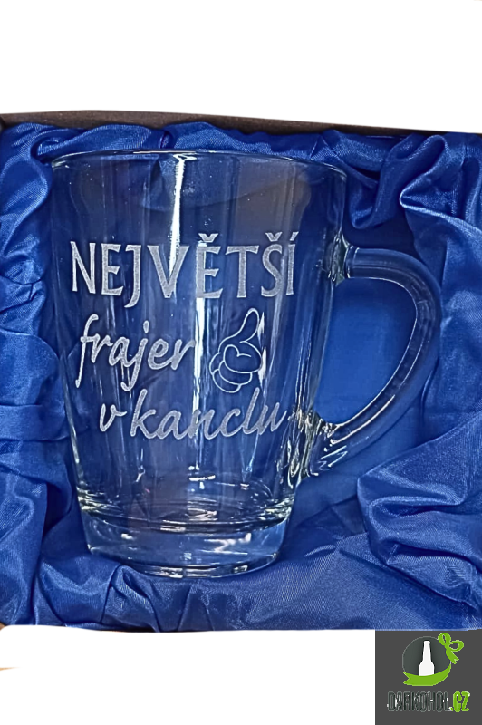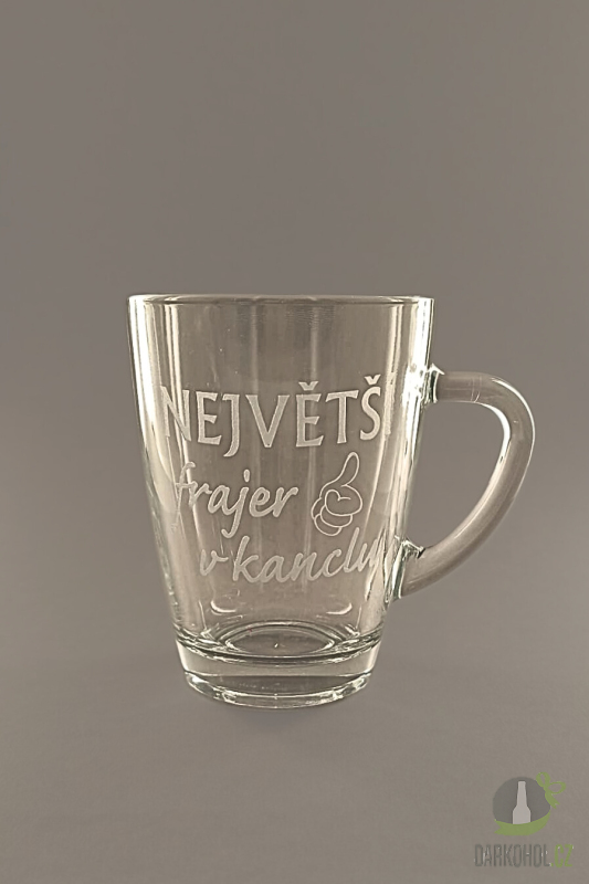 Ručně pískovaný skleněný hrnek ve tvaru Geo o objemu 0,35 l s nápisem " Největší frajer v kanclu"