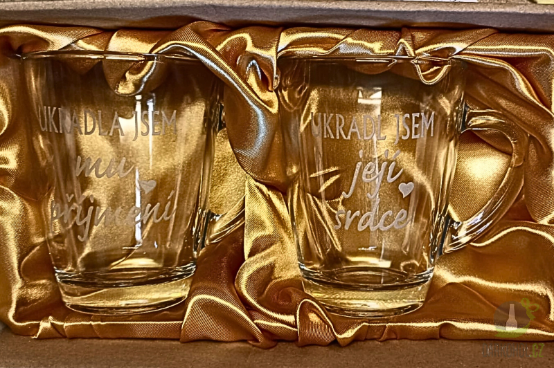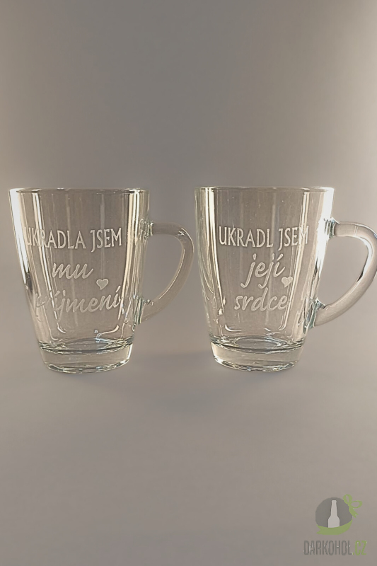 Ručně pískovaný skleněný hrnek ve tvaru Geo o objemu 0,35 l s nápisem "Ukradla jsem jeho příjmení" a "Ukradl jsem její srdce"