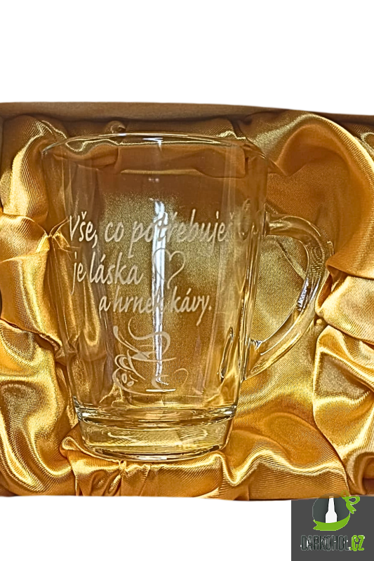Ručně pískovaný skleněný hrnek ve tvaru Geo o objemu 0,35 l s nápisem "Vše co potřebuješ je láska a hrnek kávy"