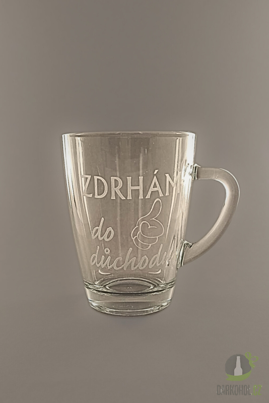 Ručně pískovaný skleněný hrnek ve tvaru Geo o objemu 0,35 l s nápisem "Zdrhám do důchodu"
