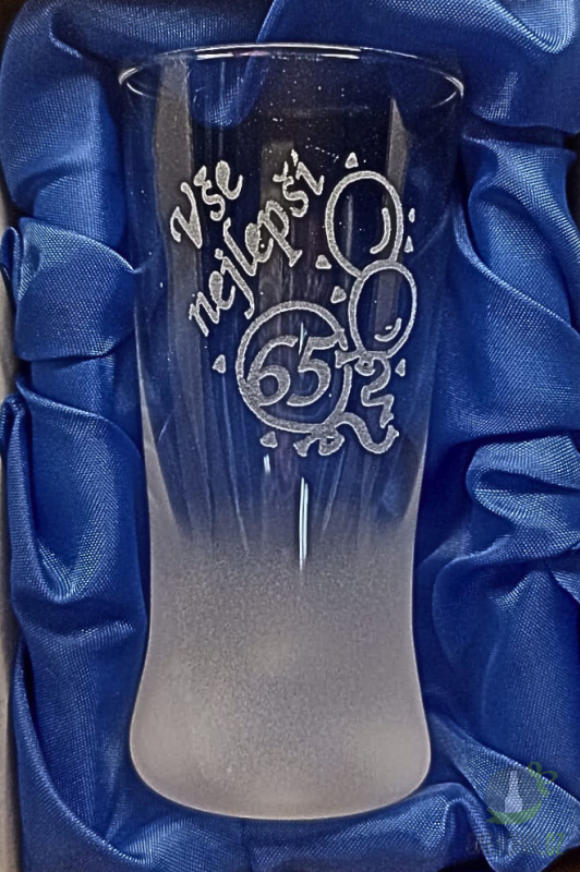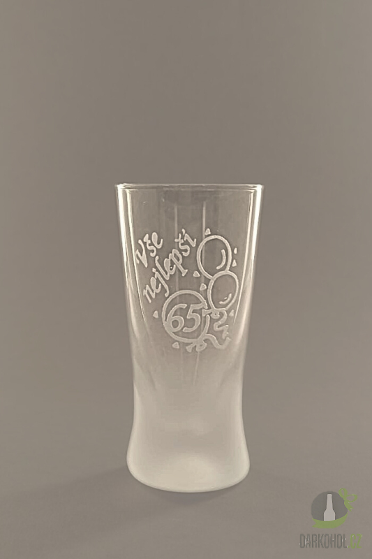 Ručně pískovaný skleněný panák ve tvaru kónickém o objemu 0,05 l s nápisem "Vše nejlepší" s motivem 65