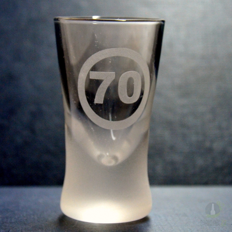 Ručně pískovaný skleněný panák ve tvaru kónickém o objemu 0,02l  " 70" s motivem 70 v kruhu