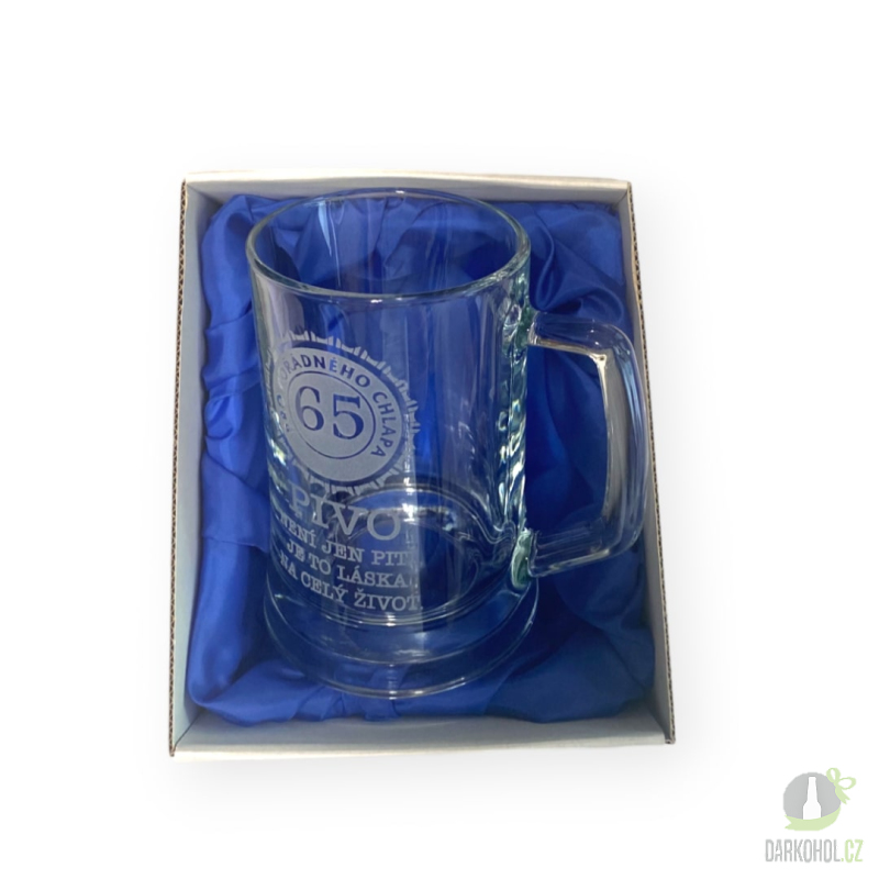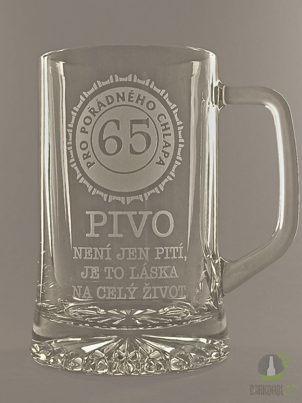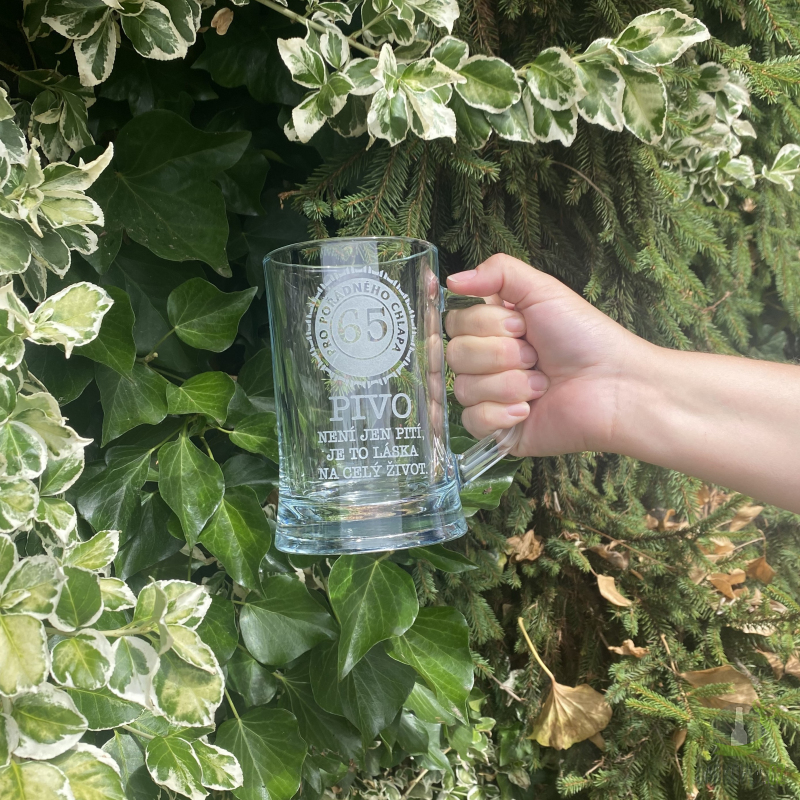 Ručně pískovaný půllitr na pivo k 65. narozeninám a textem ’’Pivo není jen pití, je to láska na celý život.’’