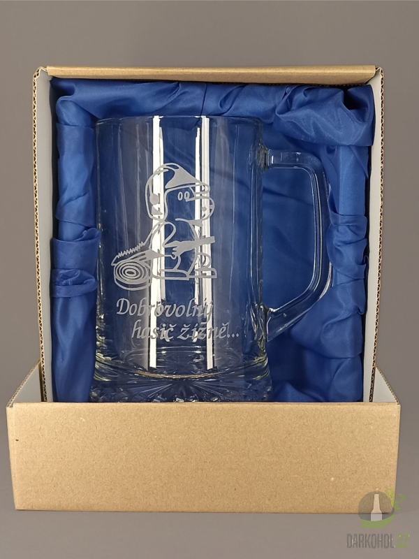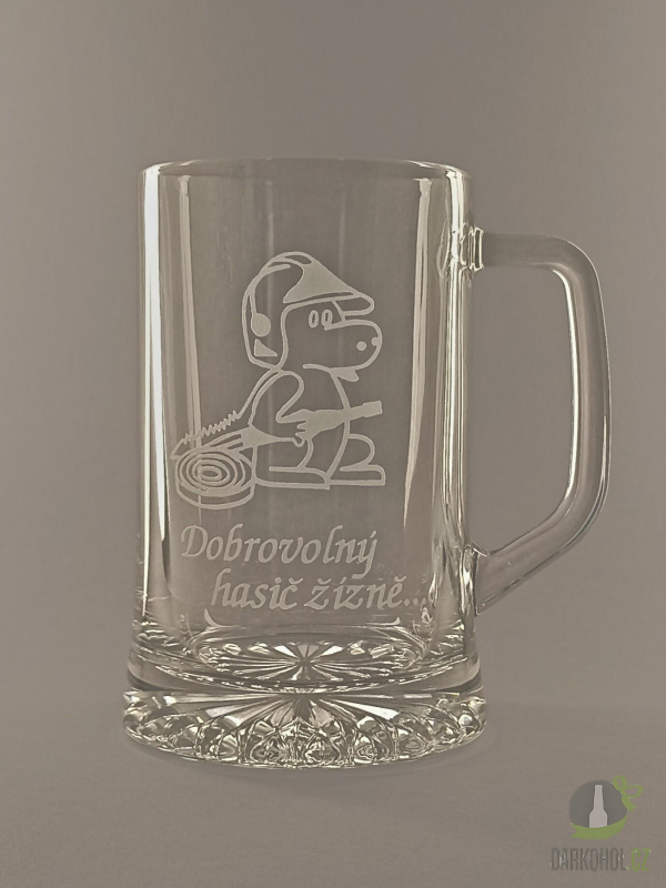 Ručně pískovaný skleněný půllitr ve tvaru půllitru s uchem o objemu 0,5 l s nápisem "Dobrovolný hasič" s motivem Hasiče