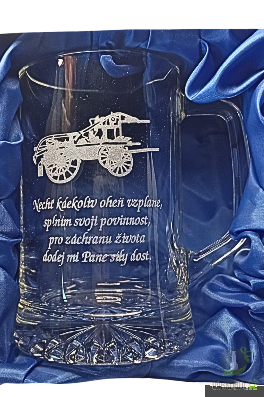 Ručně pískovaný skleněný půllitr ve tvaru půllitru s uchem o objemu 0,5 l s nápisem "Nechť kdekoliv oheň vzplane,splním svoji povinnost pro záchranu života,dodej mi pane síly dost" s motivem Hasičského vozu
