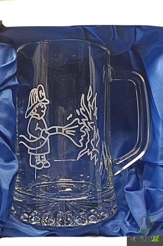 Ručně pískovaný skleněný půllitr ve tvaru půllitru s uchem o objemu 0,5 l s motivem Hasiče