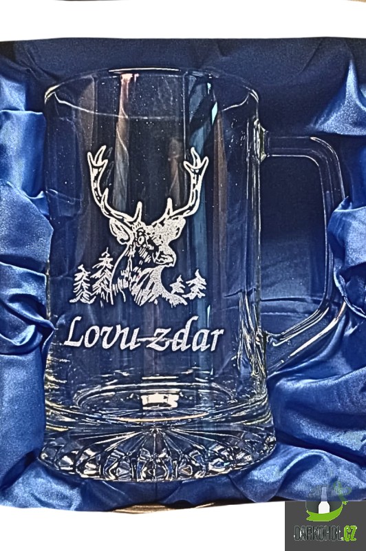 Ručně pískovaný skleněný půllitr ve tvaru půllitru s uchem o objemu 0,5 l s nápisem "Lovu zdar" s motivem Jelena