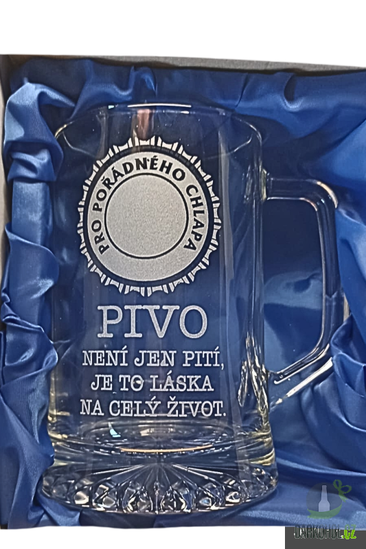 Ručně pískovaný půllitr na pivo s textem ’’Pivo není jen pití, je to láska na celý život.’’
