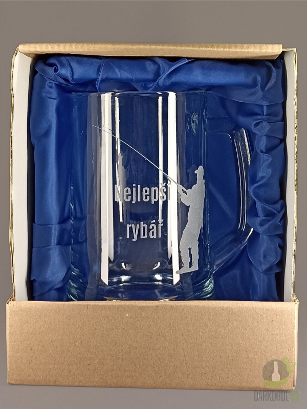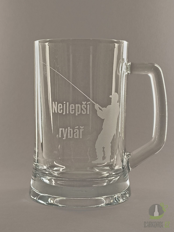 Ručně pískovaný skleněný půllitr ve tvaru půllitru s uchem o objemu 0,5 l s motivem Rybáře